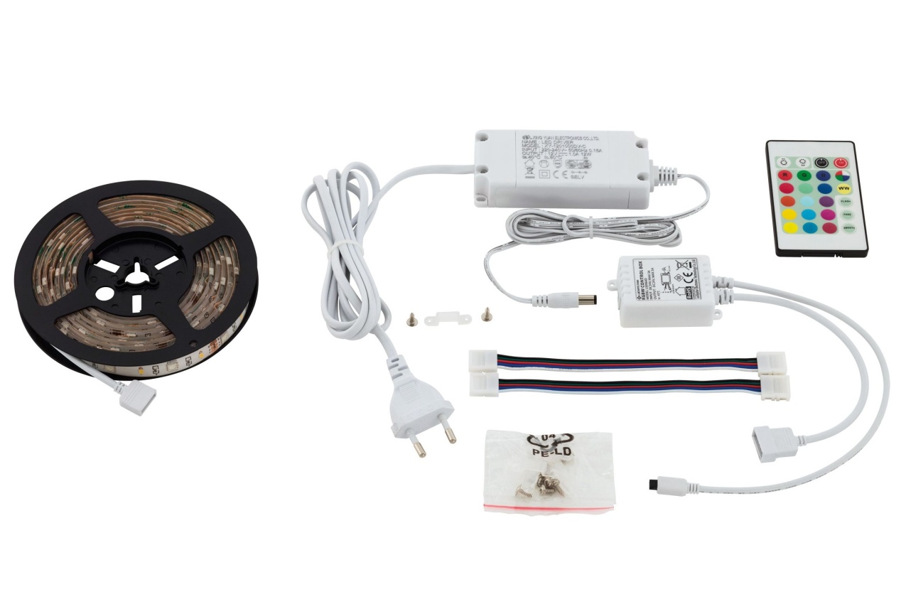 LED pásek s kompletním příslušenstvím. Celková délka 2 m. Pásek je transparentní. Pomocí dálkového ovladače lze volit barvu světla z RGB spektra a také volit barvu bílé.