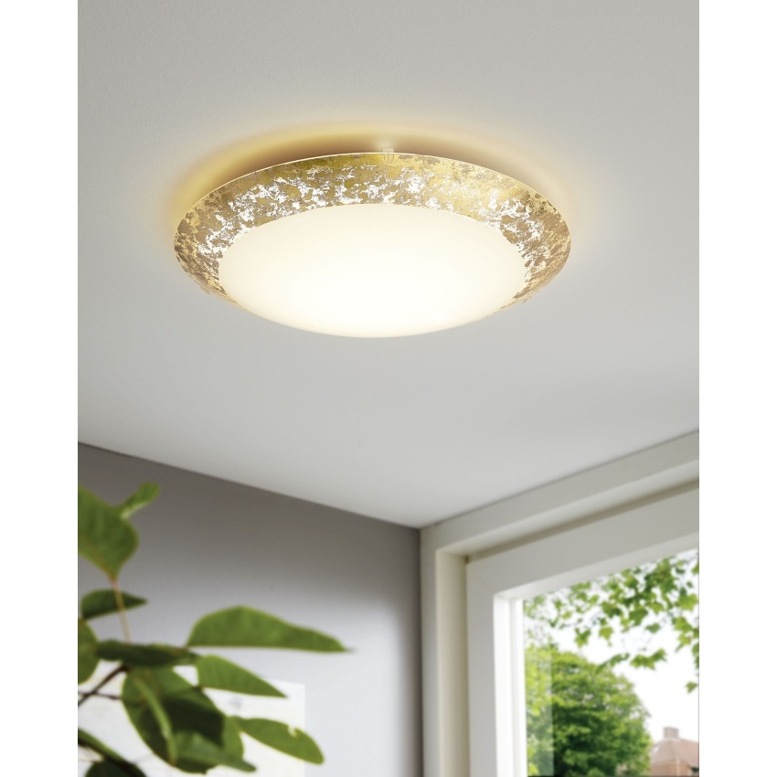 Stropní LED svítidlo MONTENOVO má kulatý bílý skleněný kryt s ozdobným lemováním s povrchovou úpravou ve stylu zlatého listu. Integrované LED diody vytvářejí příjemné teplé bílé světlo a výrobek má klasický styl, který doplňuje elegantní a moderní interiéry. Stropní svítidlo poskytuje útulné osvětlení obývacích pokojů, ložnic, chodeb nebo jídelen.