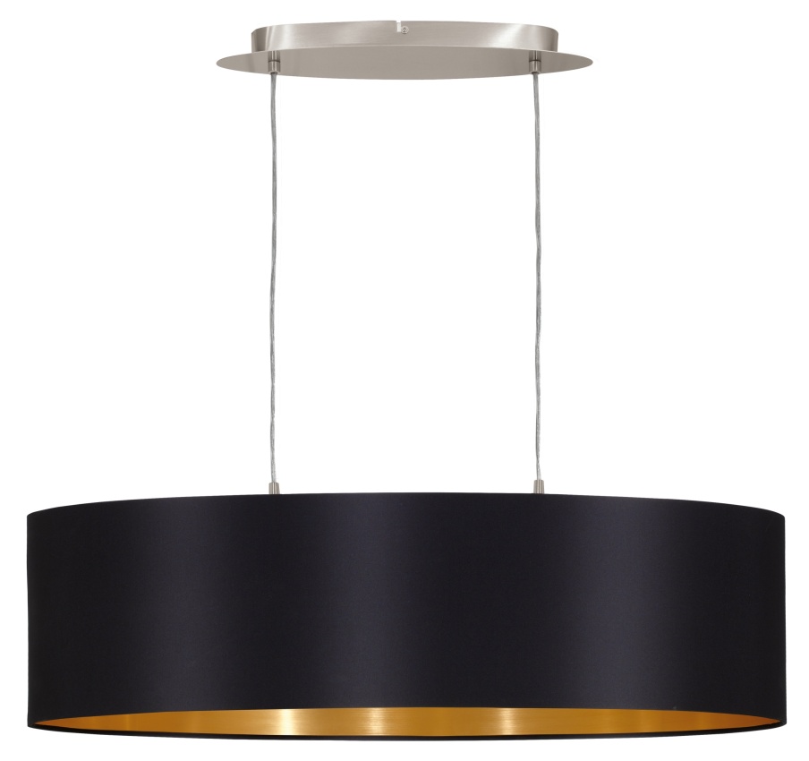 Toto závěsné svítidlo ze série MASERLO je vyrobeno ze saténově niklové oceli a látky v barvách černá a zlatá. Má ochrannou izolaci a potřebuje dvě žárovky E27, aby svítila.