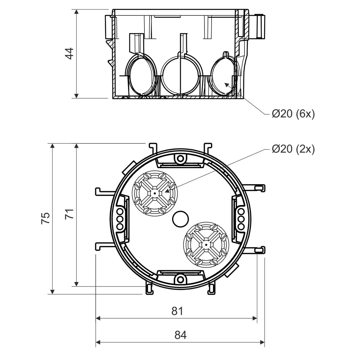 Vlastnosti: pro moderní instalace ve sdružených rámečcích. Spojení ve svislém i vodorovném směru s roztečí 71 nebo 81 mm. Možnost spojení až 5 krabic vedle sebe.