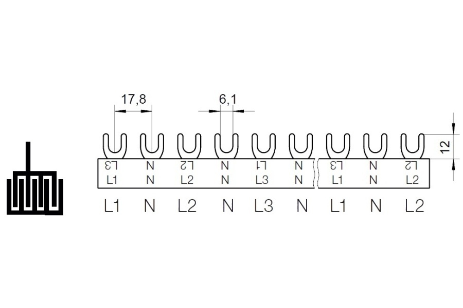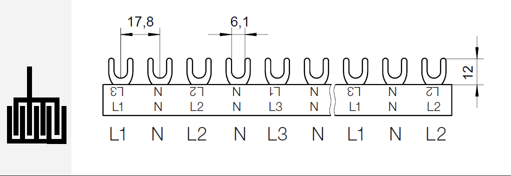Prop. lišta G-L1+N-L2+N-L3+N-1000/16 P, vidlička, 4pól., 80A, rozteč 17,8mm