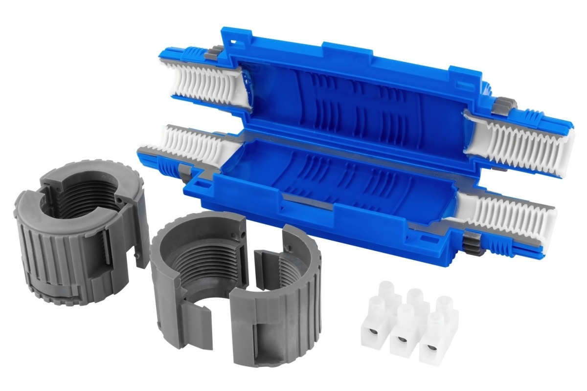 - Součástí balení je samotná spojka s gelovou výplní, pojistné matice (vývodky), svorka - dle typu, montážní návod.