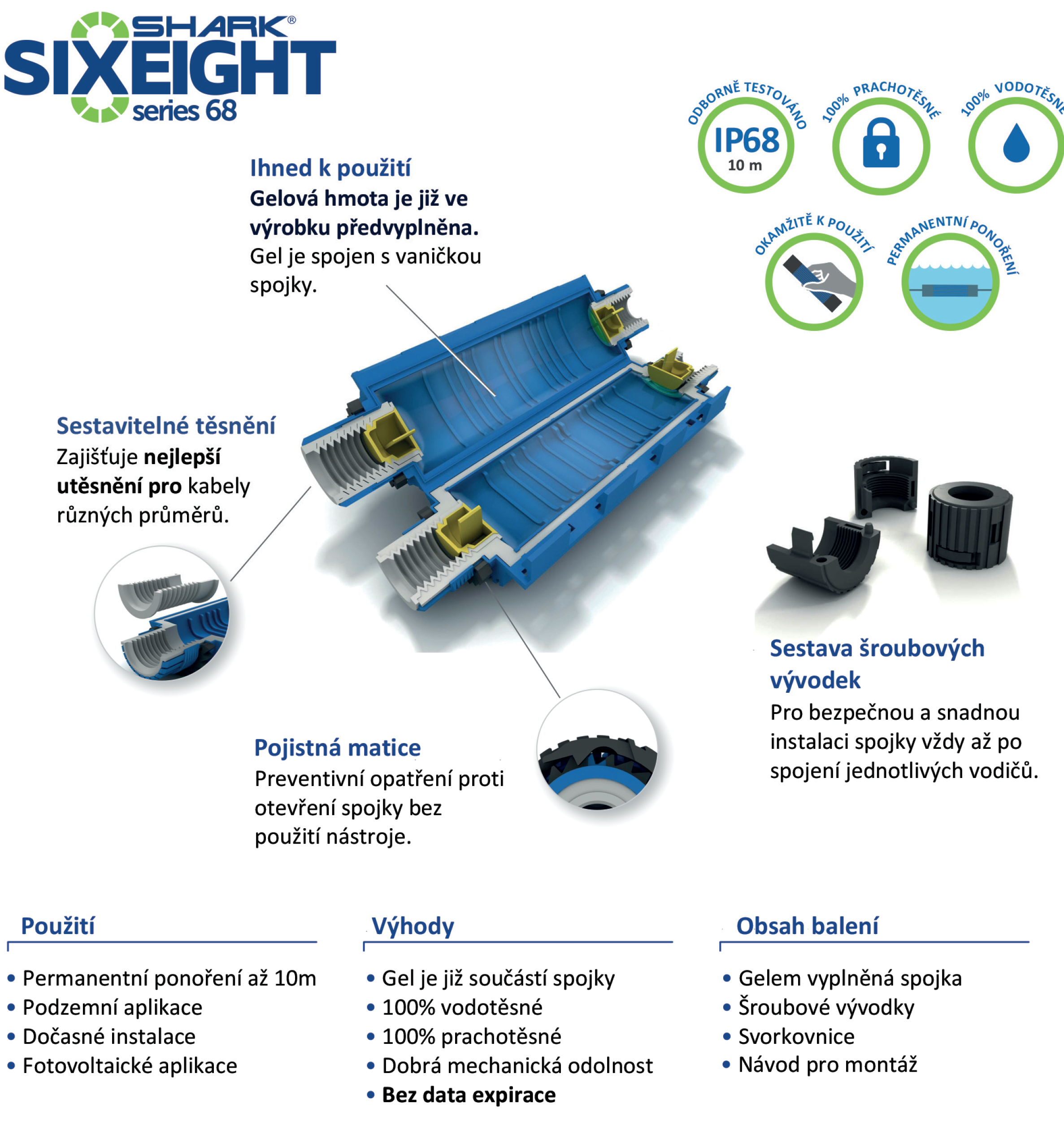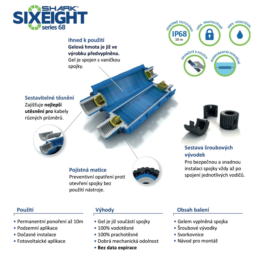 - Spojky jsou určeny pro jedno i více žilové kabely s plastovou/pryžovou izolací jako např.: CYKY, 1-CYKY a další. Kabelová gelová spojka SHARK IP68 je určena pro spojení přímé např. spojení kabelu pod vodou, spojení kabelu pod zemí, spojení kabelu na vzduchu, spojení v kabelových kanálech a nebo se dá použít jako dočasná instalace.