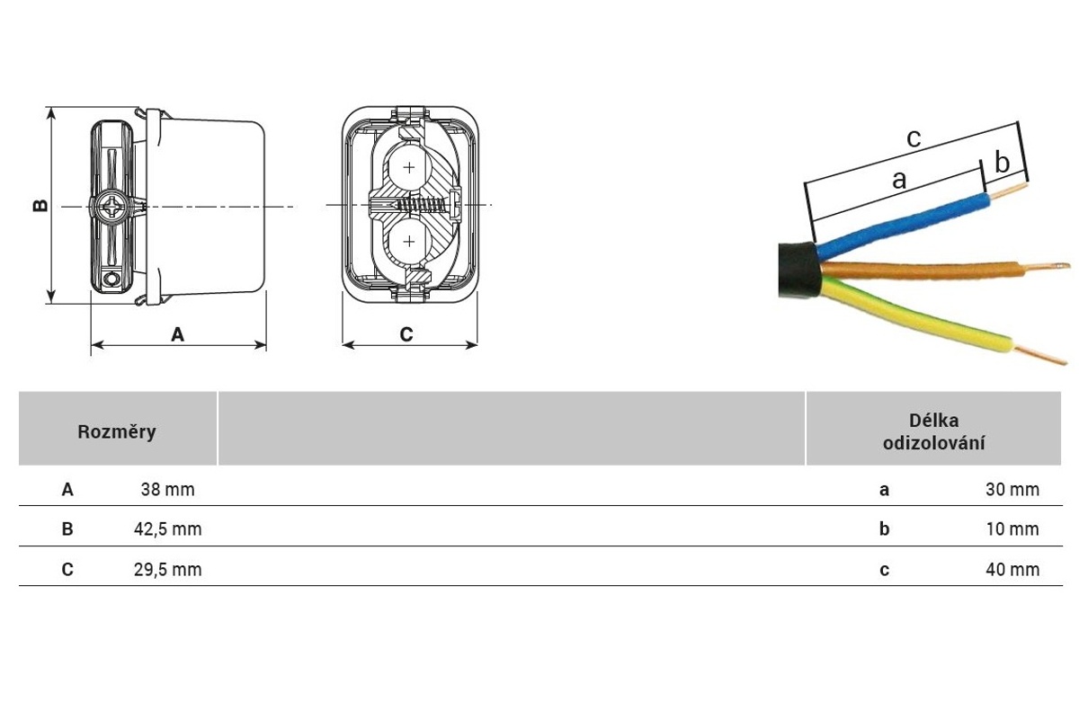 - Spojky jsou předvyplněny speciálním gelem, který má stejné vlastnosti po celou dobu životnosti elektrického spoje (bez data expirace). Součástí plastové spojky z materiálu NYLON 66 RV-AE jsou vždy šroubové svorky (s plíškem vhodným mj. i pro laněné vodiče) a vymezovací podložky pro PVC i gumové kabely.