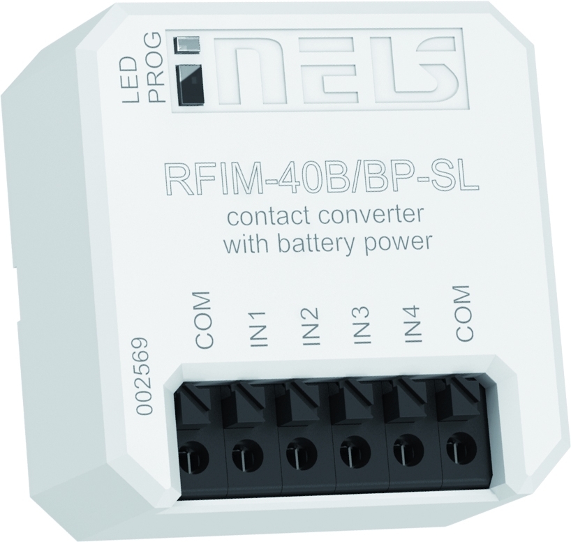 • RFIM-40B/BP-SL: bezdrátový převodník kontaktu změní drátové tlačítko/vypínač na bezdrátový. - 4 vstupy umožňují ovládat nezávisle na sobě 4 prvky, - bateriové napájení (3 V baterie CR123A - součástí balení) s životností cca 8 let dle četnosti užívání, - kontakt může být trvale sepnutý. • Lze jej využít k přenosu informace o sepnutí kontaktu (detektoru, tlačítka, technologie, logického výstupu). • Po stisku tlačítka vysílá nastavený povel (ON/OFF, stmívání, časové vypnutí/zapnutí, vytažení/zatažení). • Možnost nastavení scén, kdy jedním stiskem ovládáte více prvků iNELS RF Control. • Dosah až 200 m (na volném prostranství), v případě nedostatečného signálu mezi ovladačem a prvkem použijte opakovač signálu RFRP-20 nebo prvky s protokolem RFIO2, které tuto funkci podporují. • Komunikační frekvence s obousměrným protokolem RFIO2. • Provedení BOX nabízí montáž přímo do instalační krabice pod tlačítko/vypínač.