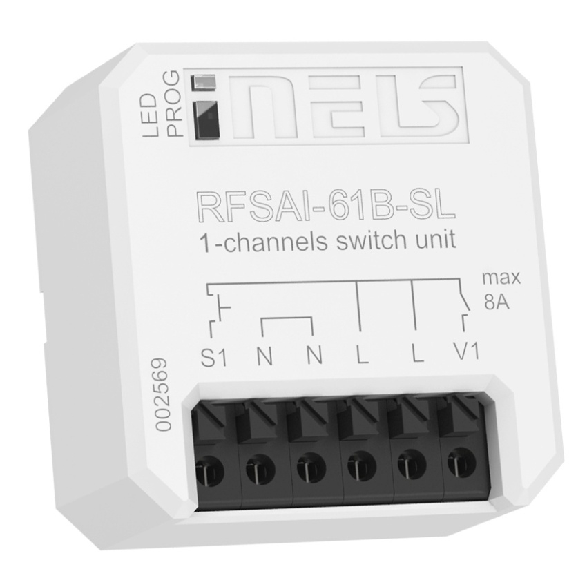 Spínací prvek s jedním / dvěma výstupními relé slouží k ovládání spotřebičů a světel. Pro ovládání lze použít vypínače/tlačítka v elektroinstalaci. Lze je kombinovat s Detektory, Ovladači nebo Systémovými prvky iNELS RF Control. Provedení BOX nabízí montáž přímo do instalační krabice, podhledu nebo krytu ovládaného spotřebiče. Snadná montáž díky bezšroubovým svorkám. Umožnuje připojení spínaných zátěží s celkovým součtem 8 A (2 000 W). Funkce: u RFSAI 61B-SL a RFSAI 62B-SL - tlačítko, impulsní relé a časové funkce zpožděného rozběhu nebo návratu s časovým nastavením 2 s-60 min. Ke každému výstupnímu relé lze přiřadit libovolnou funkci. U RFSAI-11B-SL má tlačítko pevně danou funkci - ZAP/VYP. Externí tlačítko se přiřazuje stejně jako bezdrátové. Každý z výstupů může být ovládán až 12/12 kanály (1 kanál představuje jedno tlačítko na ovladači). U RFSAI-61B-SL a RFSAI-11B-SL až 25 kanály. Programovací tlačítko na prvku slouží také jako manuální ovládání výstupu. Možnost nastavení paměti stavu výstupu při výpadku a následném obnovení napájení U prvků lze nastavit funkci opakovače (repeatru) prostřednictvím servisního zařízení RFAF/USB, PC, aplikace. Dosah až 200 m (na volném prostranství), v případě nedostatečného signálu mezi ovladačem a prvkem použijte opakovač signálu RFRP-20 nebo prvky s protokolem RFIO2, které tuto funkci podporují. Komunikace s obousměrným protokolem RFIO2. Materiál kontaktu relé AgSnO2 umožňuje spínání světelných předřadníků.
