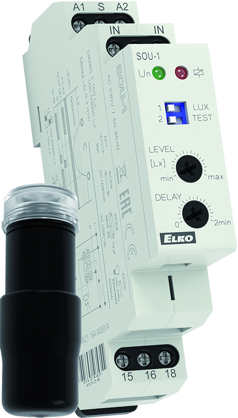 Soumrakový spínač analogový s fotosenzorem ovládání osvětlení na základě úrovně intenzity okolního světla. Používá se ke spínání pouličního a zahradního osvětlení, osvětlení reklam, výloh apod. Ovládací vstup pro blokování výstupu, např. spínacími hodinami. Úroveň osvětlení sleduje prostřednictvím externího senzoru a spíná výstup podle nastavené úrovně na přístroji, nastavitelná úroveň osvětlení ve dvou rozsazích: 1 - 100 Lx a 100 - 50000 Lx, nastavitelná časová prodleva pro eliminaci krátkodobých výkyvů v osvětlení, externí senzor s krytím IP56 s uzpůsobením pro montáž na zeď / do panelu (krytka a držák senzoru jsou součástí dodávky), výstupní kontakt: 1x přepínací 16 A, stav výstupu indikuje červená LED, v provedení 1-MODUL.