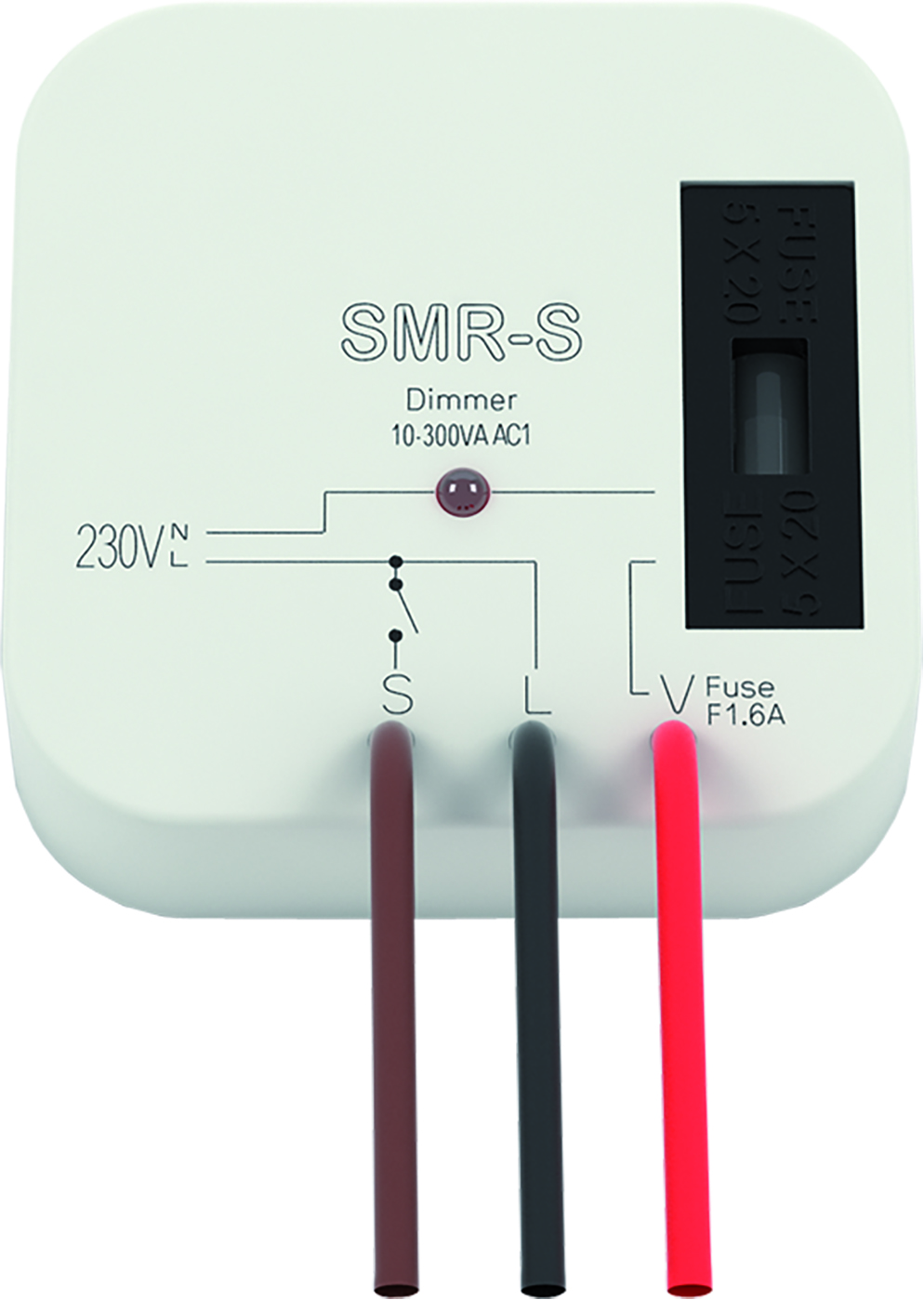 Řízený stmívač pro montáž pod tlačítko. Určený pro montáž do instalační krabice (např. KU-68) do stávající elektroinstalace. Slouží k ovládání jasu žárovek, možnost ovládání z více míst. Ochrana proti překročení teploty uvnitř přístroje - vypne výstup. Pouhou záměnou vypínače za tlačítko, pod kterým je instalováno SMR-U lze dosáhnout efektního řízení úrovně osvětlení. Umožňuje stmívání 12V halogenových svítidel s elektronickým transformátorem (kapacitní zátěž). Nelze použít pro stmívání zářivek či úsporných žárovek. SMR-S - technické specifikace: 3-vodičové připojení, funguje bez připojení “NULY, max. zátěž: 300 VA (žárovky nebo halogenová svítidla s vinutým transformátorem), bezkontaktní výstup: 1x triak, s výměnnou pojistkou.