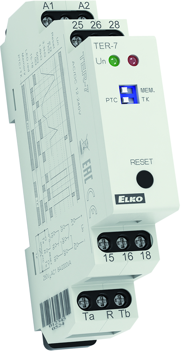 Termostat TER-7 pro kontrolu teploty vinutí motoru. Funkce PAMĚŤ - relé je při chybovém stavu zablokováno až do zásahu obsluhy. Funkce hlídání zkratu nebo odpojení senzoru, stav poruchy senzoru indikuje blikání červené LED. Stav překročení teploty motoru indikuje svit červené LED .