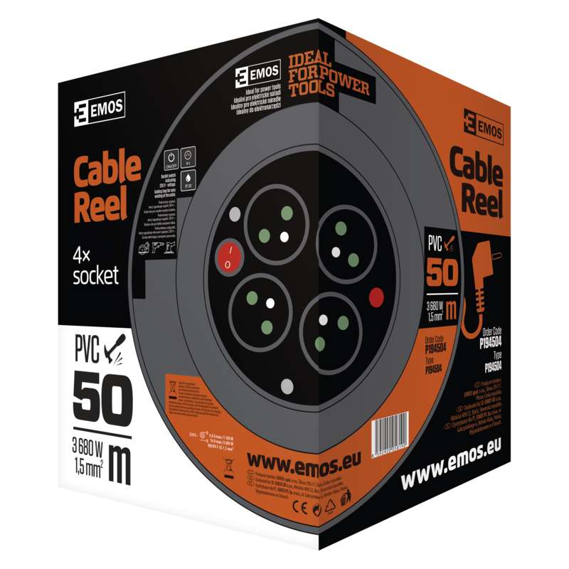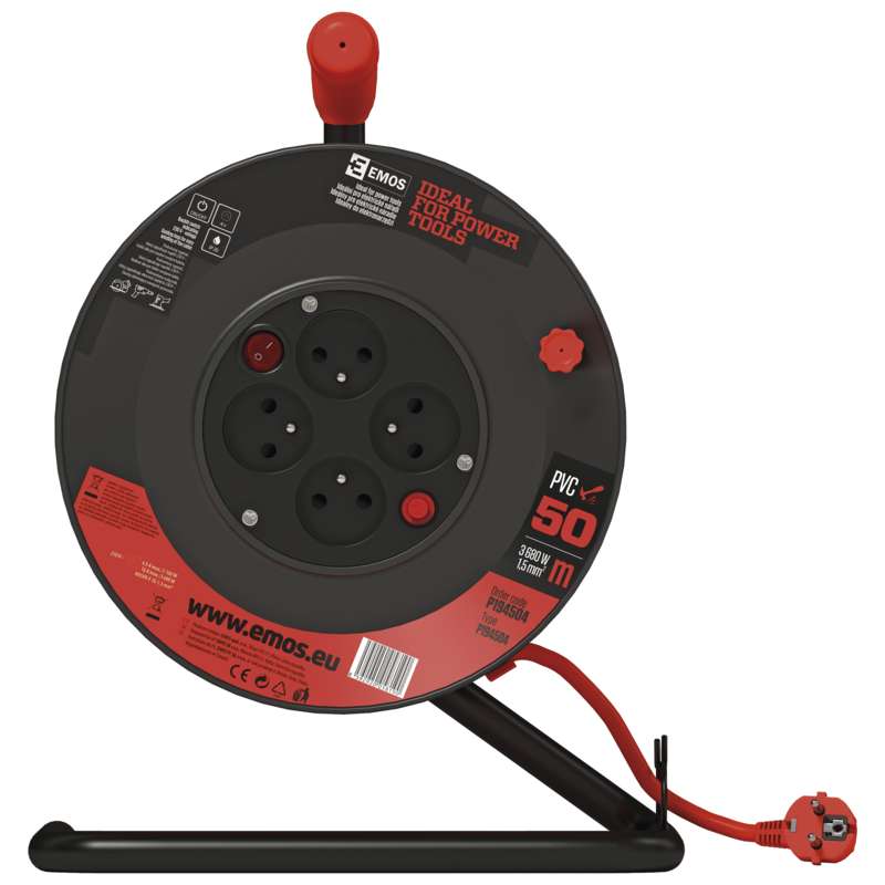 EMOS Prodlužovací kabel na bubnu 50 m / 4 zás. / s vypínačem / červený / PVC / 230V / 1,5 mm2