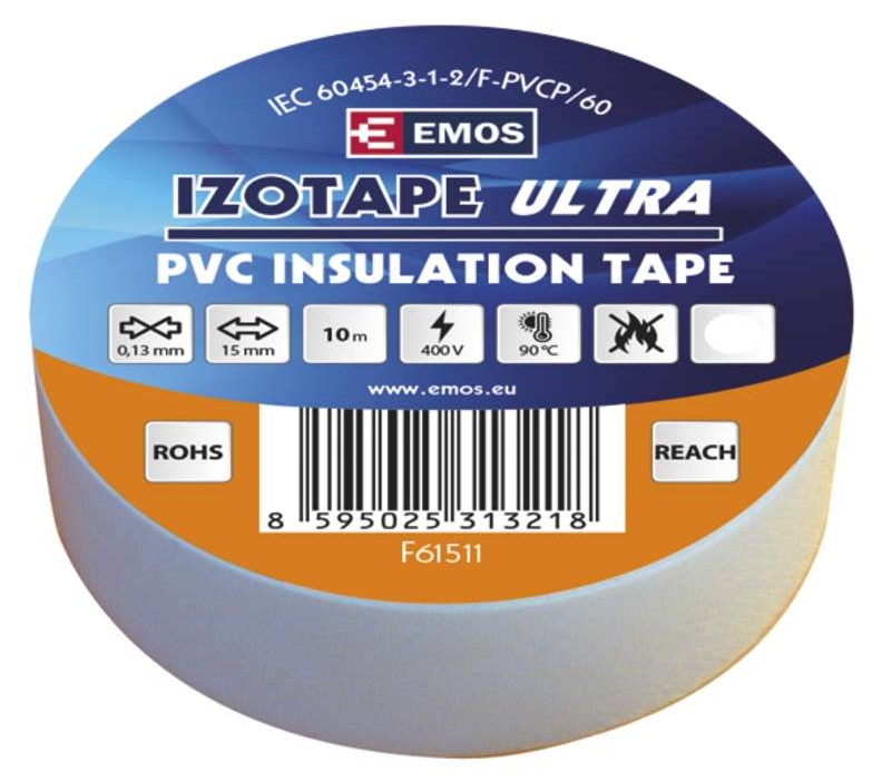 Bílá PVC izolační páska. Izolační páska má pevnost v tahu 150 N/10 mm, el. pevnost min. 40 kV/mm a el. pevnost po vlhku min. 35 kV/mm. Izolační páska odpovídá normě ČSN.
