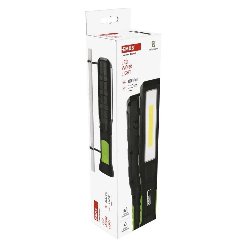 Světelný tok: 800 lm, Akumulátor: ano, Nabíjecí: ano, Technologie: COB LED + SMD LED, Materiál: plast + pogumováno, Barva těla: zeleno-černá, Šířka: 50 mm, Délka: 50 mm, Výška: 255 mm, Napájení: Li-Ion, Dosvit: 110 m, Typ baterie: 2 000 mAh/3,7 V, Baterie součástí balení: ano, Fokus: ne, Maximální dosvit: 110 m, Doba svícení: 2,5–7 h, Režimy svícení: COB LED 100 %, COB LED 50 %, SMD LED 100 %, Vybavení: otočná rukojeť, 2× hák, 2× magnet, Nárazuvzdornost: ano, Příslušenství: USB kabel, Speciální funkce: funkce rychlého vypnutí, funkce ochrany baterie, funkce powerbank, Krytí: ano (IP54), Záruka: 2 roky, Prodejní obal: 1 ks, krabice
