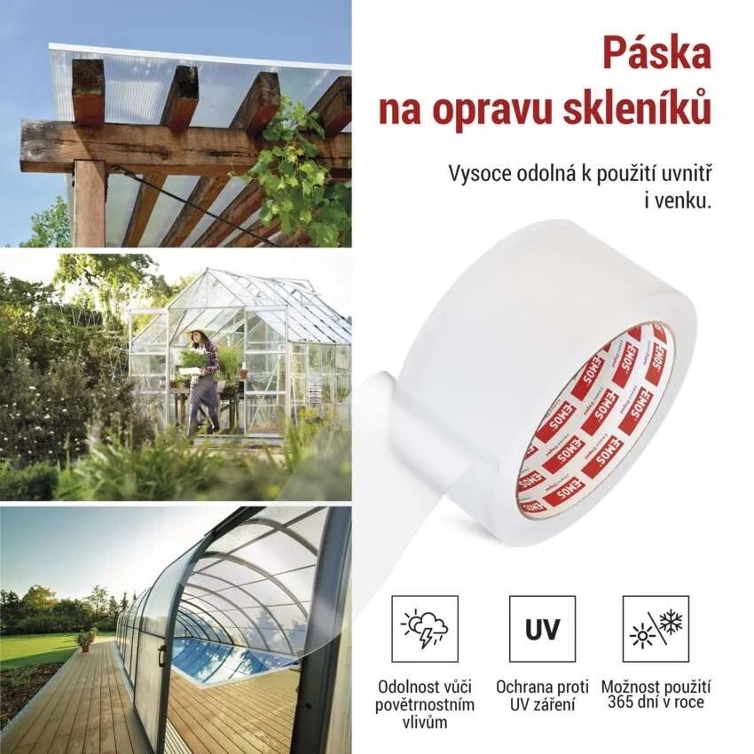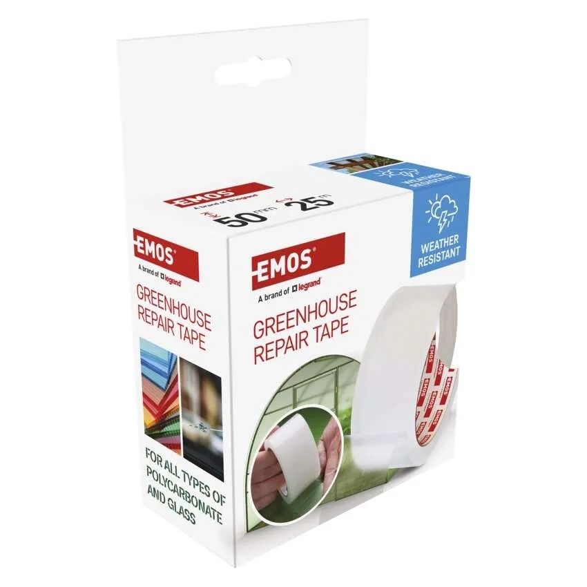 EMOS transparentní páska je spolehlivé a praktické řešení pro opravy skleníků, polykarbonátových desek a skleněných tabulí. Díky vysoké odolnosti vůči povětrnostním vlivům, vodě i UV záření je ideální pro venkovní i vnitřní použití během celého roku. Silné lepidlo zajišťuje pevné a dlouhodobé spojení, které odolá i náročným podmínkám. Páska se snadno aplikuje na hladké i mírně nerovné povrchy, průhledné provedení navíc umožňuje nenápadné opravy bez narušení vzhledu skleníku či jiných ploch.