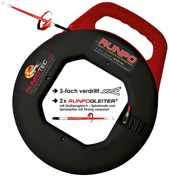 Protahovací pero RUNPO 3násobně kroucené ze speciálního plastu, vnější průměr 5,3 mm, zatížení v tahu 270 kg, délka 20 m, 2x špičky RUNPOGLEITER s okem, odolný proti zlomení i při malém poloměru ohybu, včetně plastového boxu.
