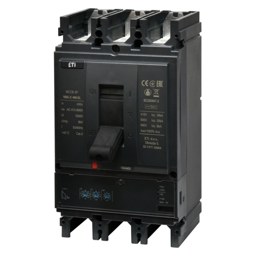 Kompaktní jistič ETI NBS-E 400/3L s jmenovitým proudem 400 A, třípólové provedení, kód 004673109.