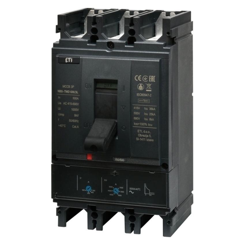 Kompaktní jistič ETI NBS-TMD 630/3L s jmenovitým proudem 500 A, třípólové provedení, kód 004673131.