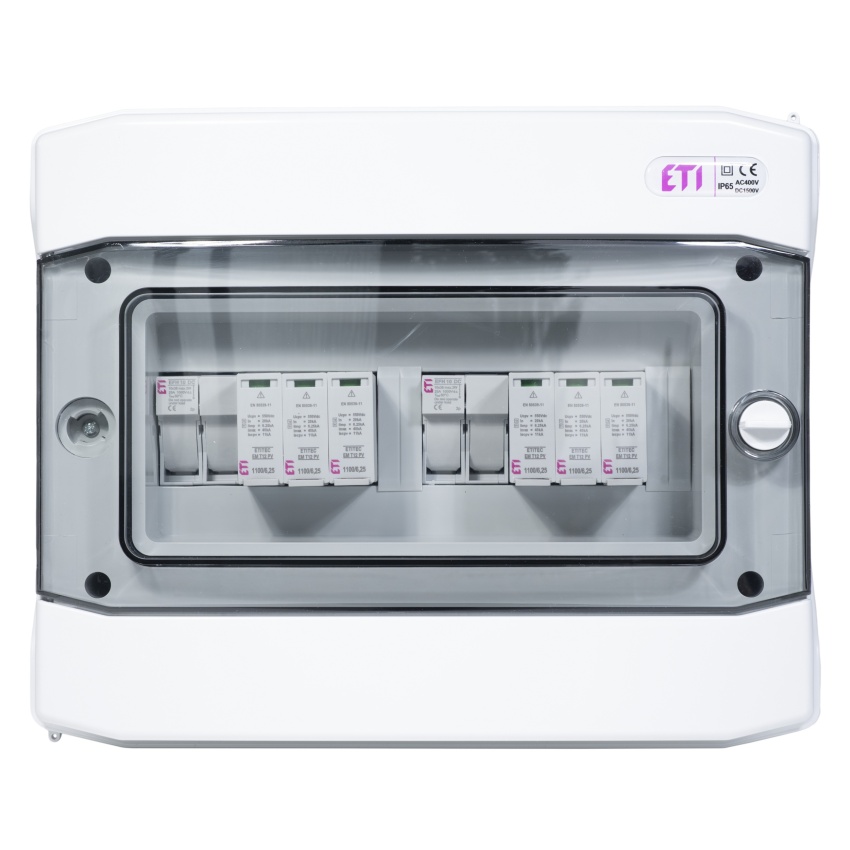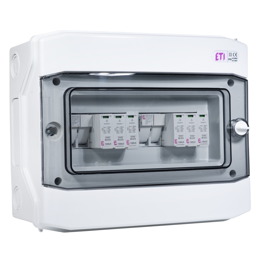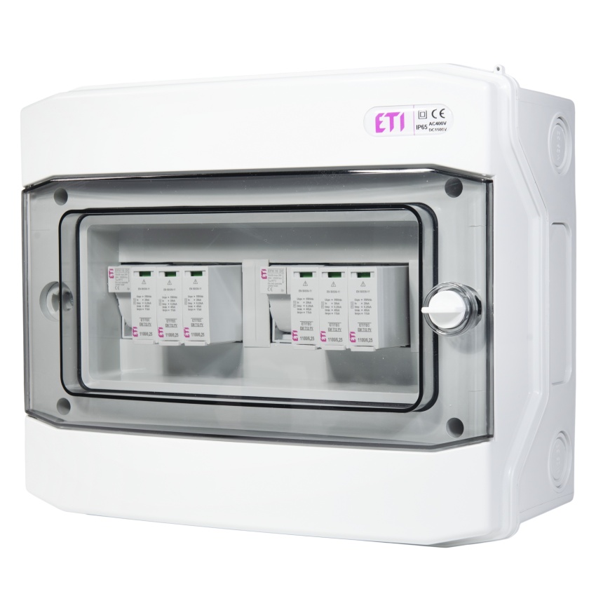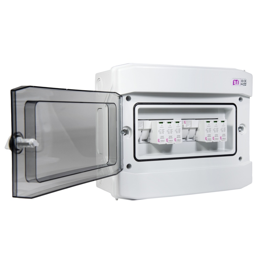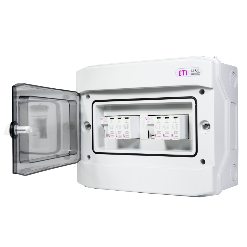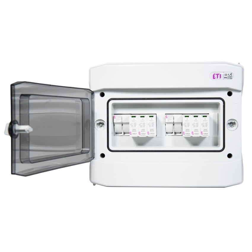 ETI rozváděč RFVE-DC2-2-T12 – DC nástěnná rozvodnice pro 2 stringy, třída ochrany I+II, montáž na omítku, 12 modulů, krytí IP65