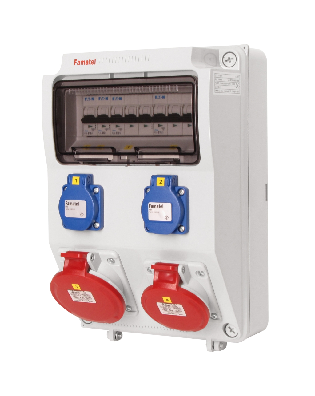 Zásuvková skříň (rozváděč nízkého napětí) v385-6kA-ZSF20101000.0 /3958 IP54 jištěná bez chrániče, zásuvky 2x230V/16A (s ochranným kolíkem dle ČSN), 1x400V/16A/5pól, 1x400V/32A/5pól, jistící přístroje EATON 6kA: 2xPL6-B16/1, 1xPL6-B16/3, 1xPL6-B32/3, použité pouzdro: 3958 - celkem k dispozici 9mod. míst, rozměry: 330x215x155mm, plastová, materiál ABS, IK08, zkouška žhavou smyčkou 650°C, bezhalogenová a UV odolná, montáž na povrch, barva: světle šedá, rozsah teplot -25°C + 85°C, aplikované normy: IEC 61439-3 (Rozváděče nízkého napětí - Část 3: Rozvodnice určené k provozování laiky (DBO), balení: 1ks (fólie), zásuvky na 230V/16A s ochranným kolíkem dle ČSN, polykarbonátové okénko, jistící prvky EATON, PE svorkovnice součástí (6x16mm2), N svorkovnice součástí (6x16mm2), hladké stěny (bez prolisů) pro vyvrtání vstupního otvoru a následné osazení příslušnou vývodkou (pro CYKY 5x6; 4x10; 5x10 => M25; pro CYKY 5x16 => M32), max. připojitelný vstupní kabel = 4x25 nebo 5x16 (Cu), dodáno s průvodní dokumentací: štítkem rozváděče, návodem pro obsluhu a montáž, krycím listem (charakteristiky rozhraní), protokolem o kusové zkoušce, ES prohlášením o shodě, schématem zapojení a zkouškou oteplení pro rozváděče nízkého napětí. Pro montáž na hořlavé podklady je nutné použít nehořlavou podložku.