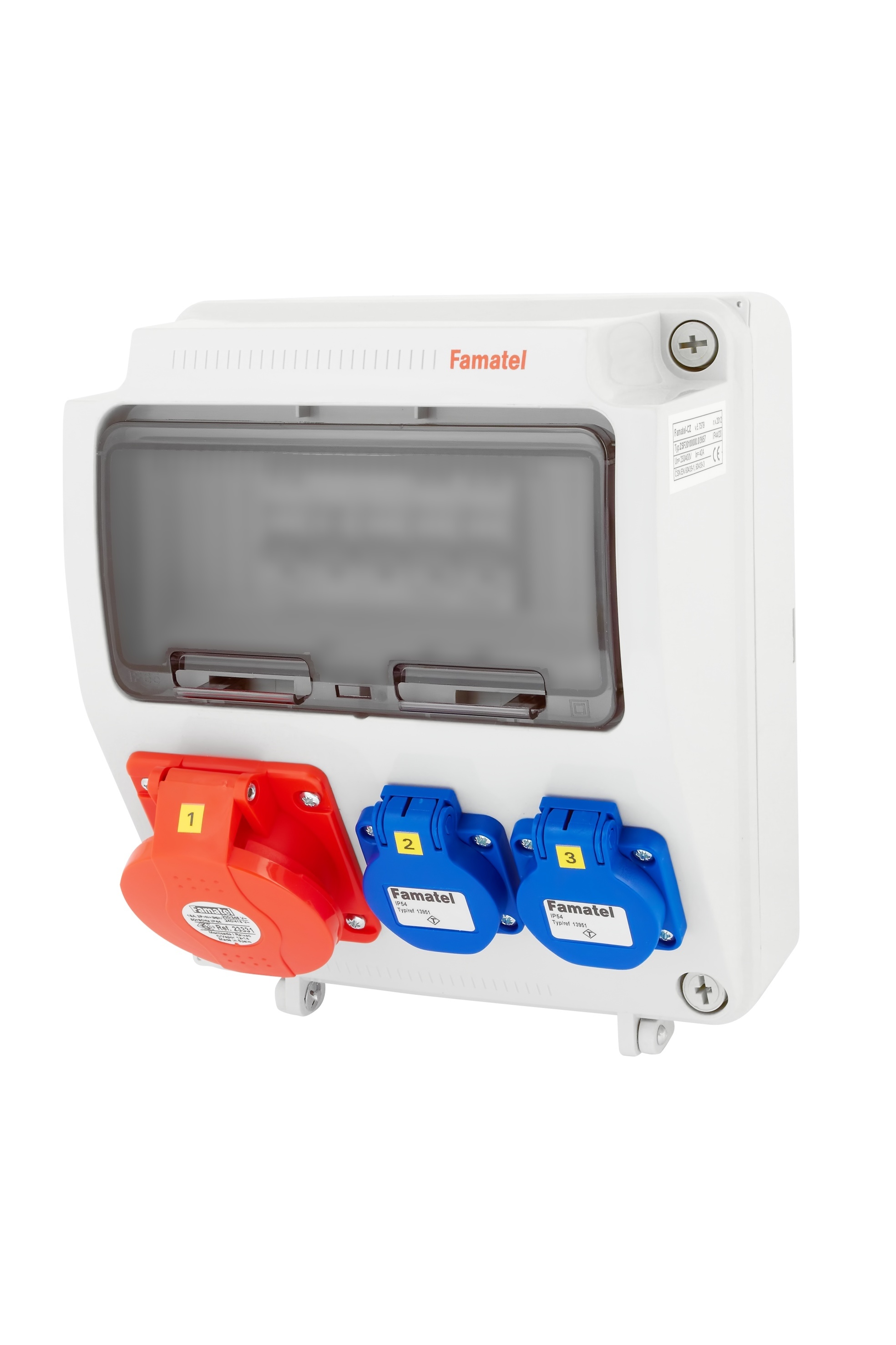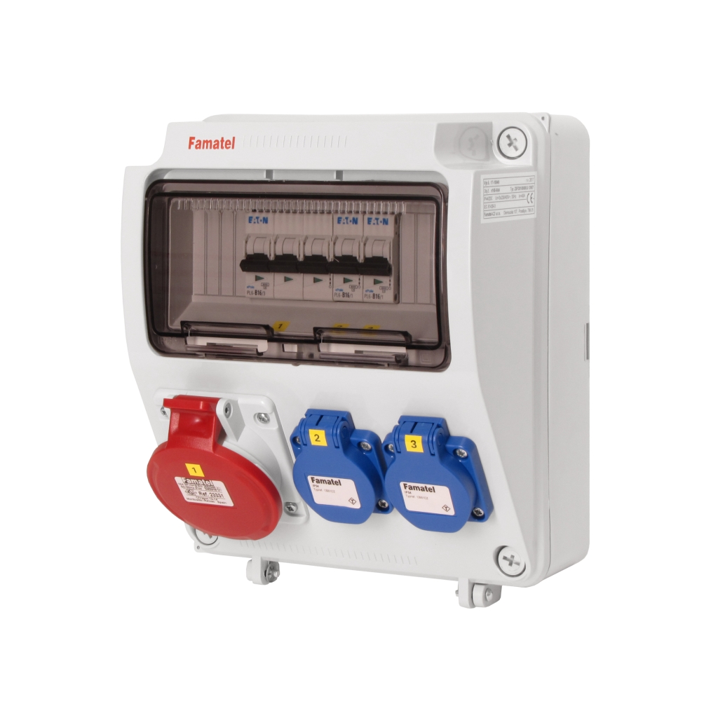 Zásuvková skříň FAMATEL v160-6kA-ZSF20100000.0 /3957 IP54, jištěná bez chrániče, zásuvky 1x400V/16A, 2x230V/16A, přístroje EATON 6kA: 2xPL6-B16/1, 1xPL6-B16/3, použité pouzdro: 3957 - celkem k dispozici 9mod. míst, rozměry: 245x215x155mm, plastová, materiál ABS, IK08, zkouška žhavou smyčkou 650°C, bezhalogenová a UV odolná, montáž na povrch, barva: světle šedá, rozsah teplot -25°C +85°C, aplikované normy: IEC 61439-3 (Rozváděče nízkého napětí - Část 3: Rozvodnice určené k provozování laiky (DBO), balení: 1ks (fólie), zásuvky na 230V/16A s ochranným kolíkem dle ČSN, polykarbonátové okénko, jistící prvky EATON, PE svorkovnice součástí (6x16mm2), N svorkovnice součástí (6x16mm2), hladké stěny (bez prolisů) pro vyvrtání vstupního otvoru a následné osazení příslušnou vývodkou (pro CYKY 5x6; 4x10; 5x10 => M25; pro CYKY 5x16 => M32), max. připojitelný vstupní kabel = 4x25 nebo 5x16 (Cu), dodáno s průvodní dokumentací: štítkem rozváděče, návodem pro obsluhu a montáž, krycím listem (charakteristiky rozhraní), protokolem o kusové zkoušce, ES prohlášením o shodě, schématem zapojení a zkouškou oteplení pro rozváděče nízkého napětí. Pro montáž na hořlavé podklady je nutné použít nehořlavou podložku.