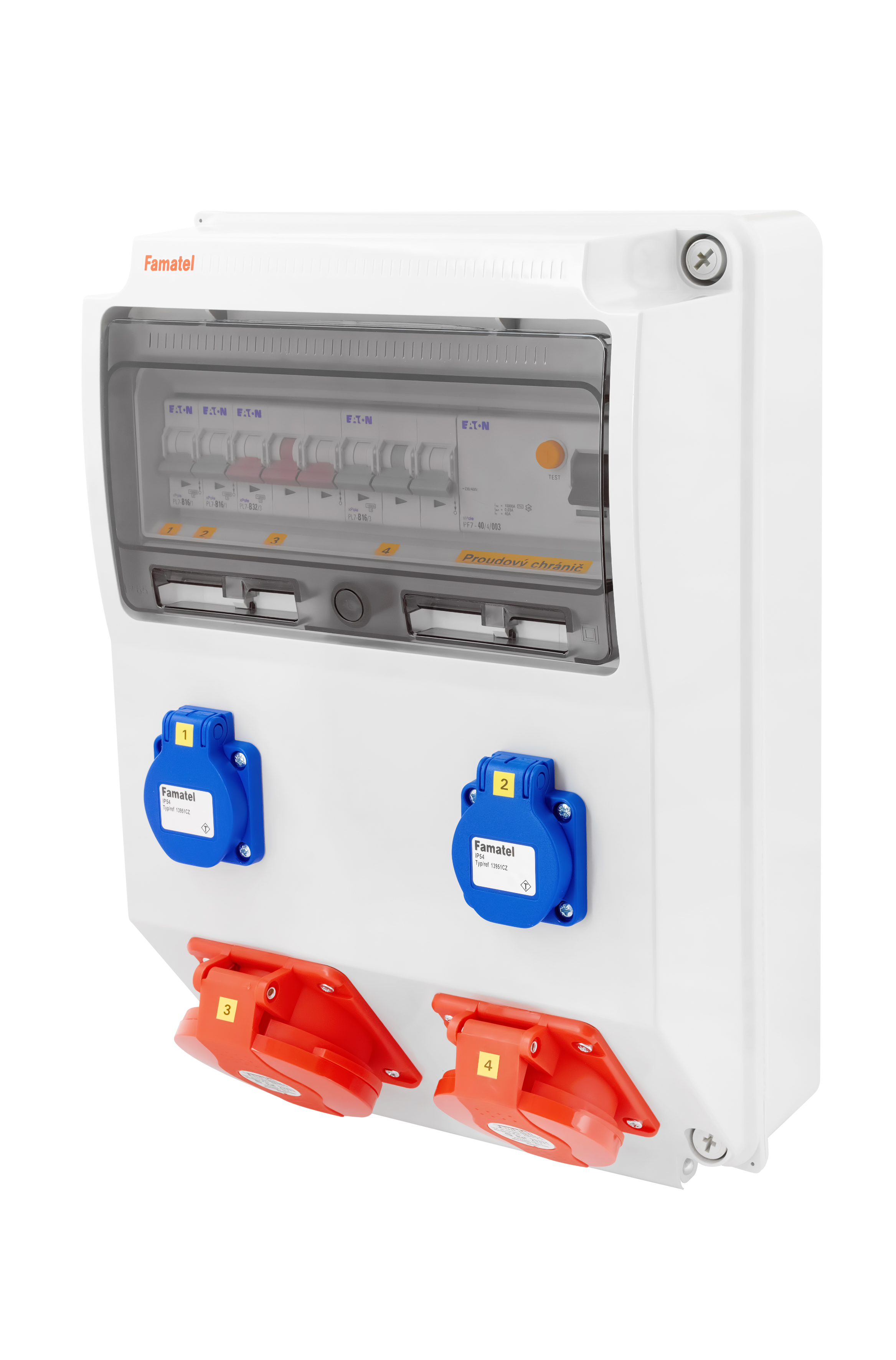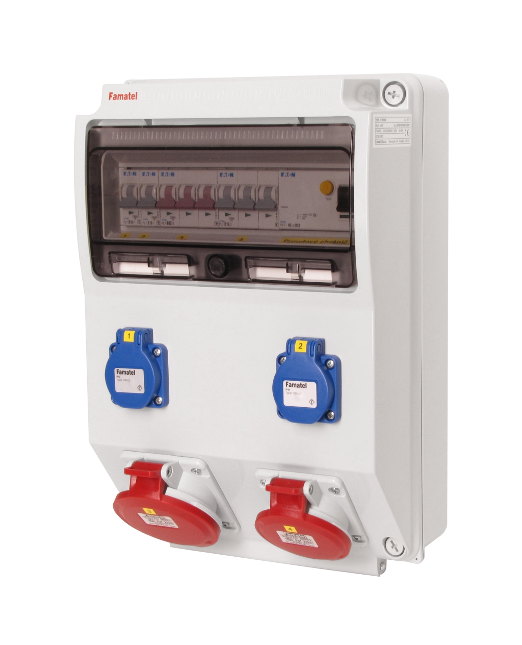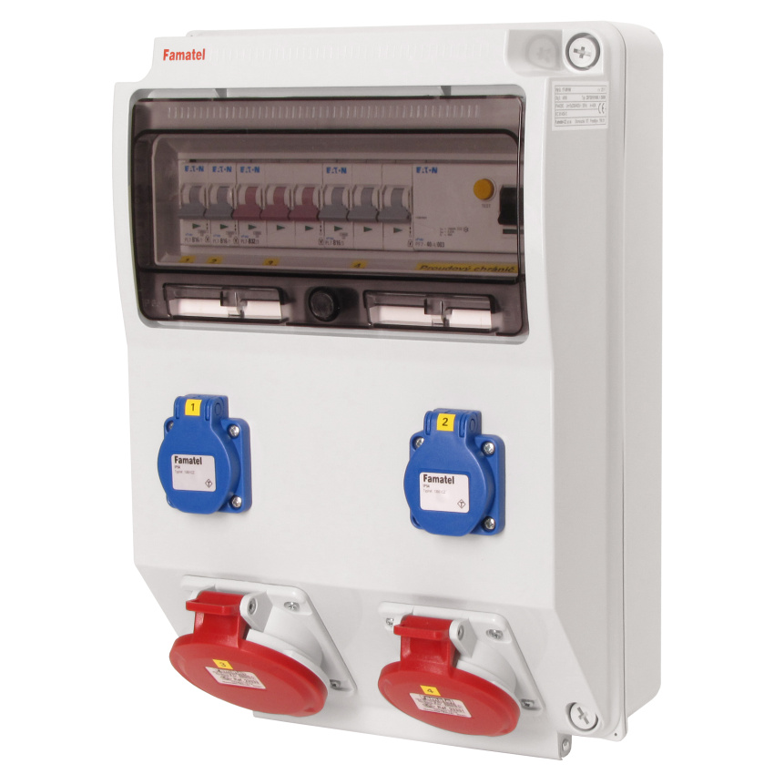 Zásuvková skříň (rozváděč nízkého napětí) FAMATEL v310-ZSF20101000.1 /3959 IP54 jištěná s chráničem 40/4/003, zásuvky 2x230V/16A (s ochranným kolíkem dle ČSN), 1x400V/16A/5pól, 1x400V/32A/5pól , jistící přístroje EATON 10kA: 2xPL7-B16/1, 1xPL7-B16/3, 1xPL7-B32/3, PF7-40/4/003 na vstupu (citlivost na reziduální proud 30mA), použité pouzdro: 3959 - celkem k dispozici 12mod. míst, rozměry: 398x266x153mm, plastová, materiál ABS, IK08, zkouška žhavou smyčkou 650°C, bezhalogenová a UV odolná, montáž na povrch, barva: světle šedá, rozsah teplot -25°C +85°C, aplikované normy: IEC 61439-3 (Rozváděče nízkého napětí - Část 3: Rozvodnice určené k provozování laiky (DBO), balení: 1ks (fólie), zásuvky na 230V/16A s ochranným kolíkem dle ČSN, polykarbonátové okénko, jistící prvky EATON, PE svorkovnice součástí (6x16mm2), N svorkovnice součástí (6x16mm2), stěny s předlisovanými vstupy pro vyvrtání vstupního otvoru a následné osazení příslušnou vývodkou (pro CYKY 5x6; 4x10; 5x10 => M25; pro CYKY 5x16 => M32), max. připojitelný vstupní kabel = 4x25 nebo 5x16 (Cu), dodáno s průvodní dokumentací: štítkem rozváděče, návodem pro obsluhu a montáž, krycím listem (charakteristiky rozhraní), protokolem o kusové zkoušce, ES prohlášením o shodě, schématem zapojení a zkouškou oteplení pro rozváděče nízkého napětí. Pro montáž na hořlavé podklady je nutné použít nehořlavou podložku.