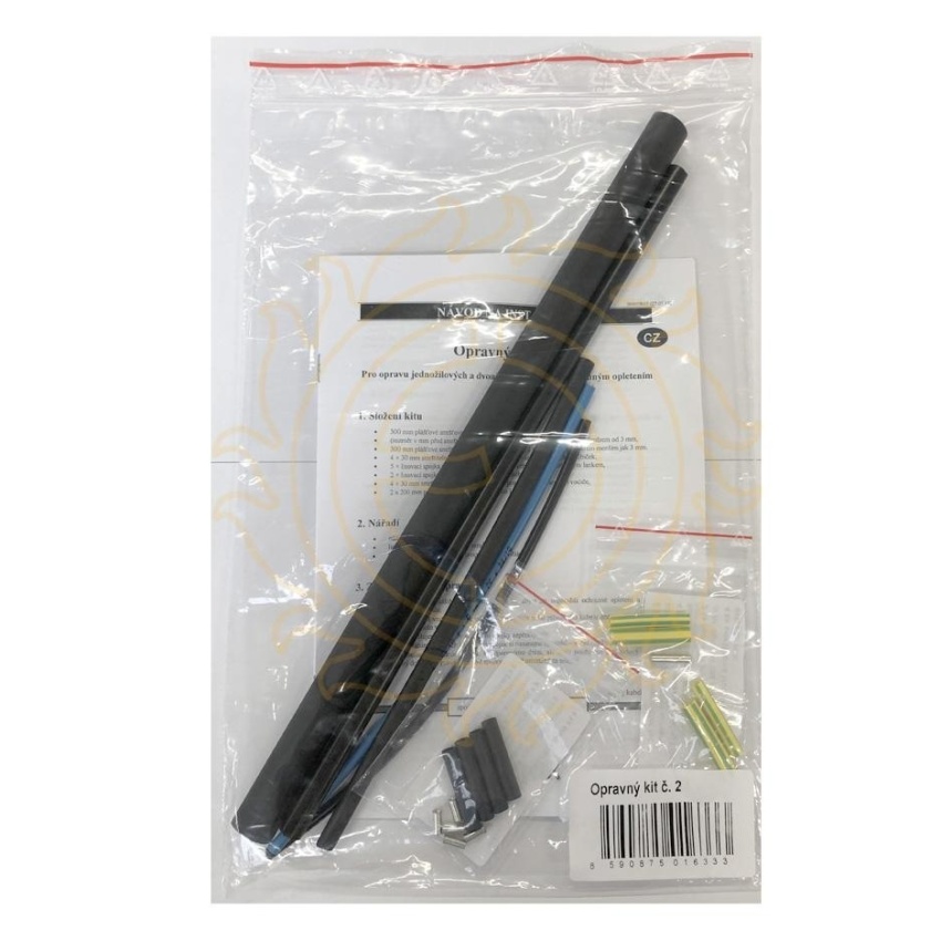 KIT č.2 slouží k opravě kabelů s opletením (bez rozdílu výkonů - okruhy PSV nebo rohože L(S)DTS, LD, T). Sada obsahuje lisovací spojky, izolační trubičky s lepidlem, propojovací kabel a návod k opravě.