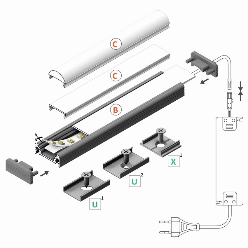 AL profil určený pro jeden LED pásek. Pásek se jednoduše nalepí do profilu, profil je určený pro přímou montáž přisazením nebo zavěšením. Profil zároveň plní funkci chlazení (odvod ztrátového tepla) což je nutné u výkonných LED pásků.