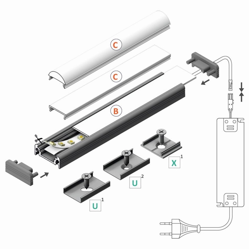AL profil určený pro jeden LED pásek. Pásek se jednoduše nalepí do profilu, profil je určený pro přímou montáž přisazením nebo zavěšením. Profil zároveň plní funkci chlazení (odvod ztrátového tepla) což je nutné u výkonných LED pásků.