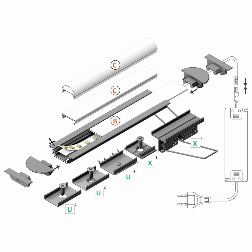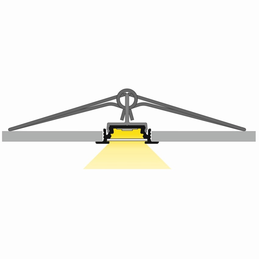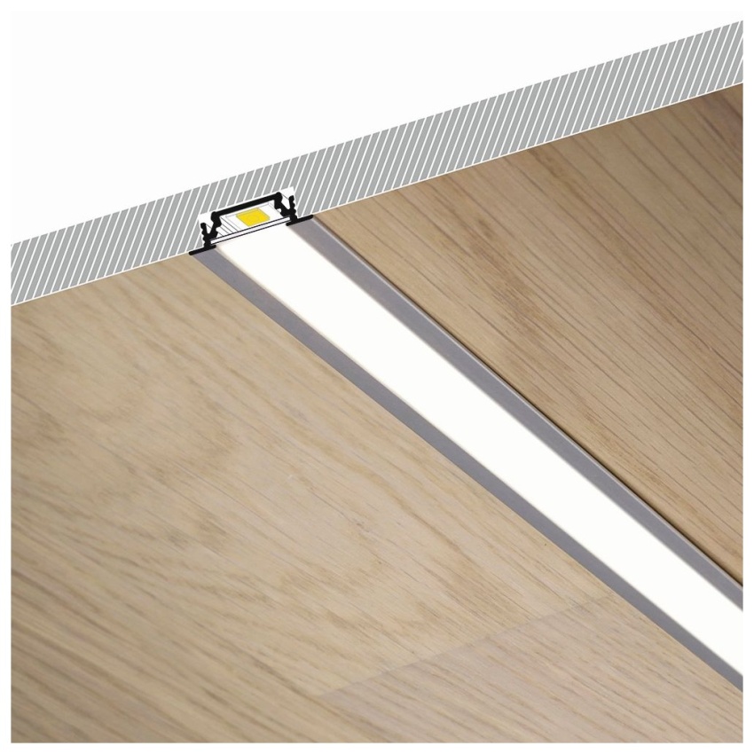 AL profil určený pro jeden LED pásek. Pásek se jednoduše nalepí do profilu a profil se osadí do vyfrézované drážky. Profil zároveň plní funkci chlazení (odvod ztrátového tepla) což je nutné u výkonných LED pásků.