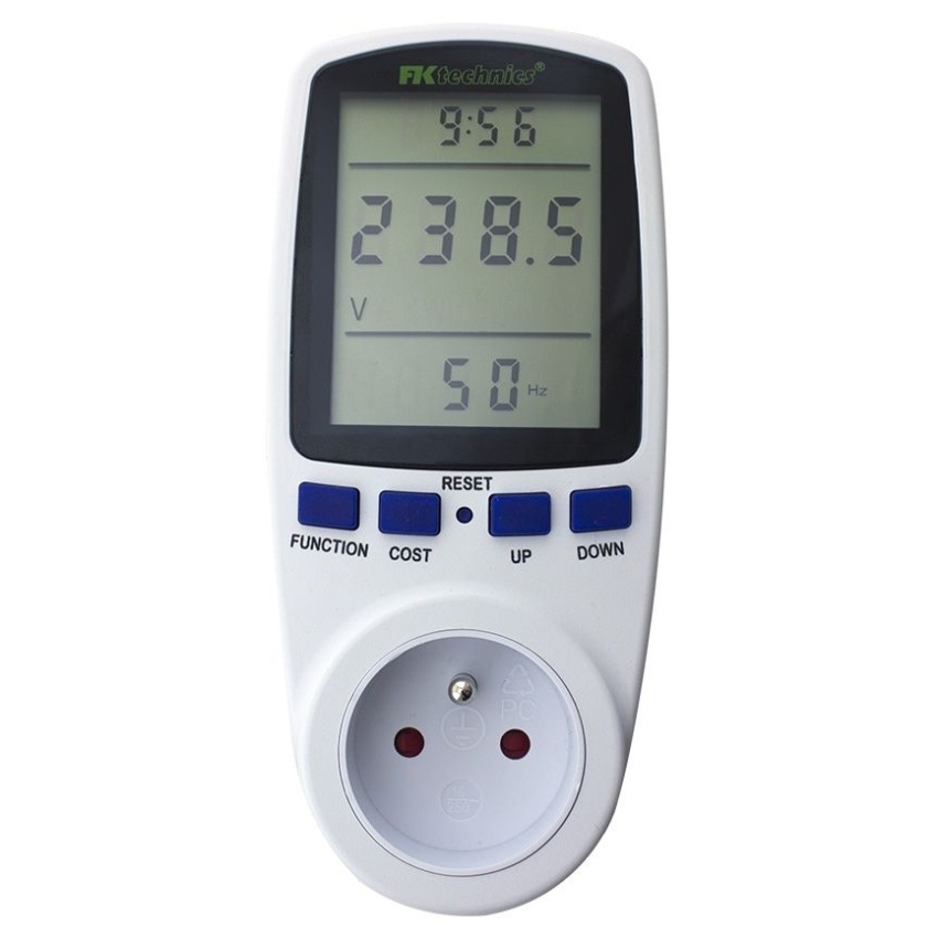 Tento užitečný a přitom snadno obsluhovatelný přístroj umožňuje přehledným způsobem zjišťovat, měřit a sledovat spotřebu elektrické energie elektrických spotřebičů. Dále také vypočítat náklady za elektrickou energii a zaznamenat dobu připojení elektrických spotřebičů k měřiči. Navíc Vám umožní zobrazení aktuální hodnoty napětí, proudu, spotřeby energie, zatížení zásuvky (výkon zařízení ve wattech), účiníku, nebo frekvence el. sítě. Dále také měřič zaznamená min. a max. hodnotu spotřeby energie připojeného spotřebiče.