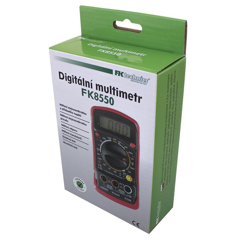 Malý a přesto robustní digitální multimetr FK8550 s 3,5 místným displejem pro měření všech základních elektrických veličin. Díky robustní konstrukci vydrží měřící přístroj i trochu hrubší zacházení, takže je ideálním měřícím přístrojem pro každodenní použití. Pro pohodlné čtení údajů na displeji je FK8550 vybaven podsvětleným LCD displejem. Měření stejnosměrného i střídavého napětí, Měření stejnosměrného proudu, Měření odporu, Akustický test průchodnosti, Diodový test, Měření h21E malovýkonných bipolárních tranzistorů, Podsvětlení displeje, DATA HOLD. Zesilovací činitel h21E: 0..1999