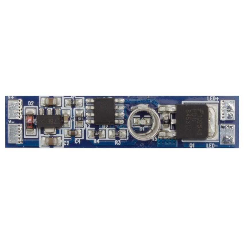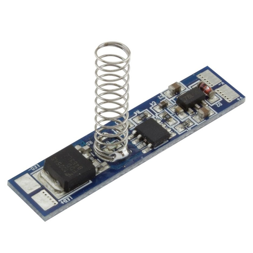 Dotykový spínač určený pro přímou montáž do AL profilu. Pro ovládání funkcí nevyužívá vodivé spojení s AL profilem, ale ovládá se pomocí dotyku na difuzoru (plexi) v místě spínače. Místo indikuje svítící modrá LED.