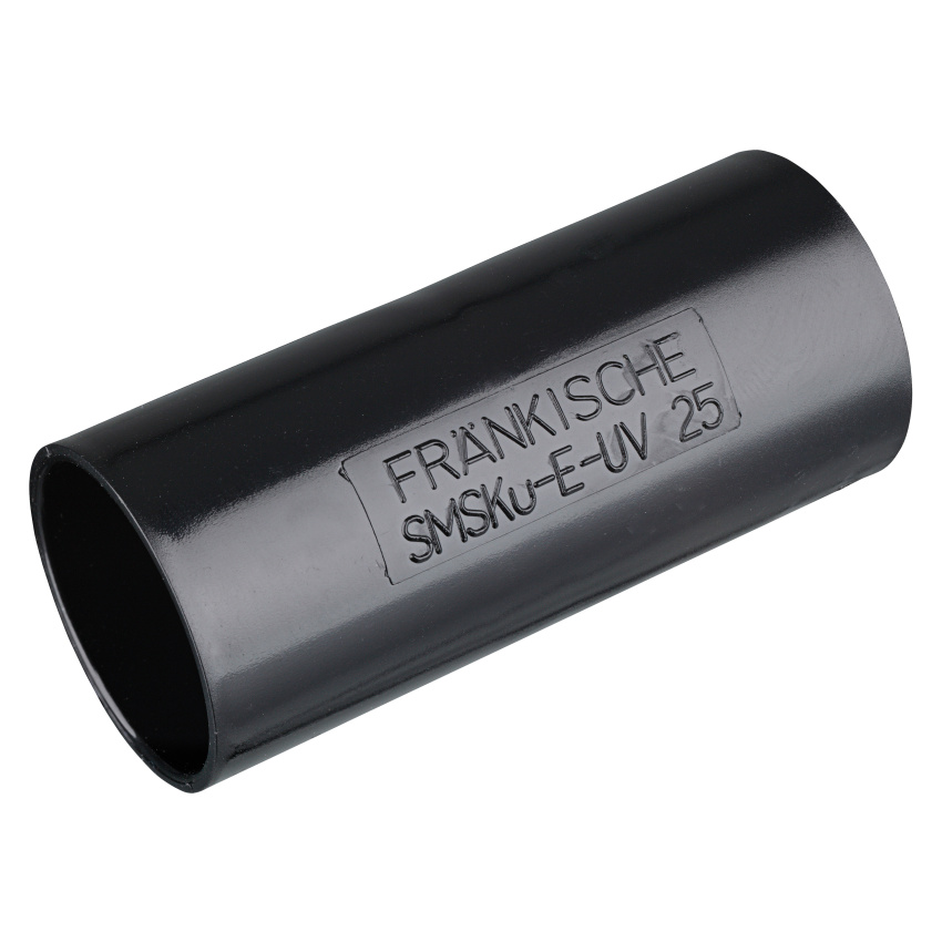 Plastová násuvná spojka z modifikovaného PVC v černé barvě (RAL 9005), která brání šíření plamene a je stabilizovaná proti UV záření.