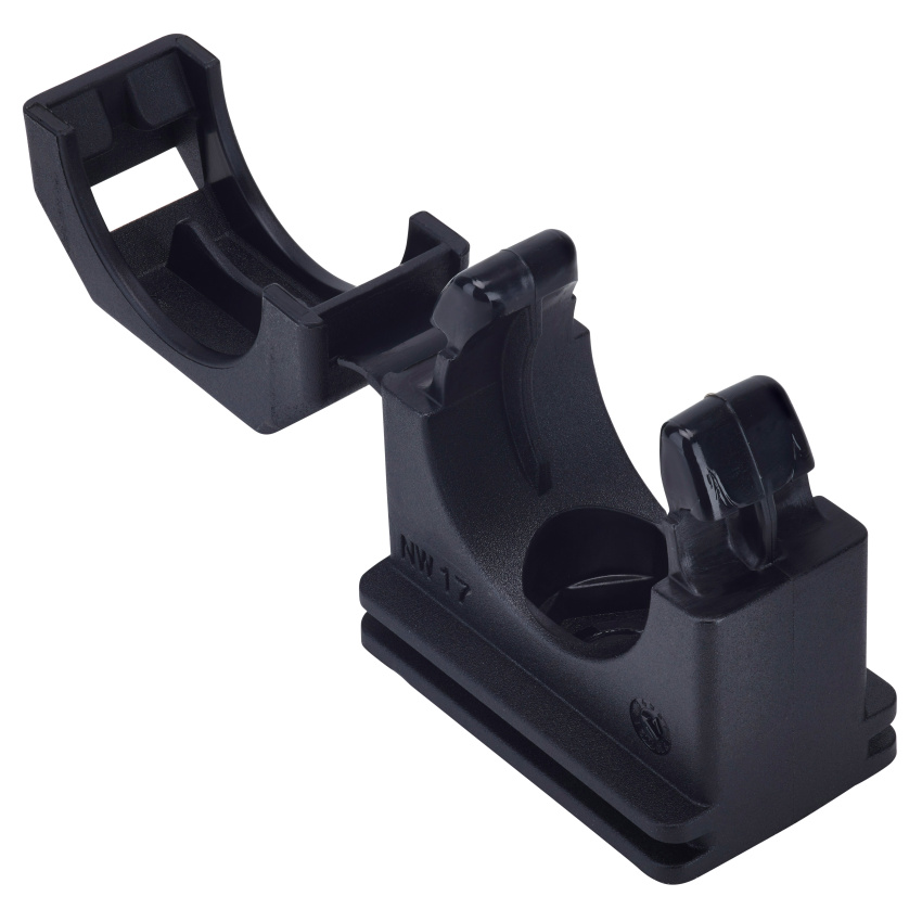 Plastový držák ohebné trubky z polyamidu 6. Je bezhalogenový, brání šíření plamene a je k dostání v černé barvě.