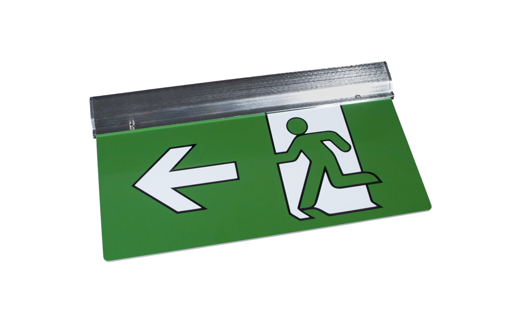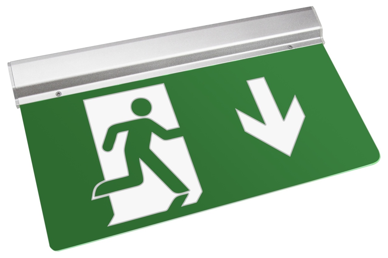 LED nouzové svítidlo s praporkem UNIXIT UX340 a piktogramem (šipka dolů), svítidlo lze namontovat jako přisazené na strop i stěnu nebo jako závěsné pomocí příslušných držáků.