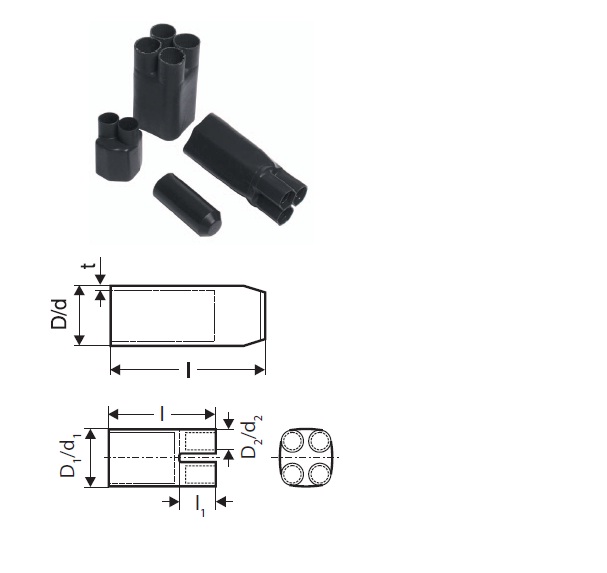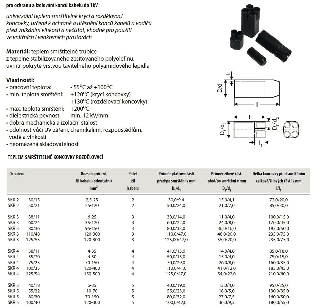Teplem smrštitelná koncovka rozdělovací, čtyřžilová. Určená k ochraně a utěsnění konců kabelů a vodičů do 1kV před vnikáním vlhkosti a nečistot, vhodné pro použití ve vnitřních i venkovních prostorách.