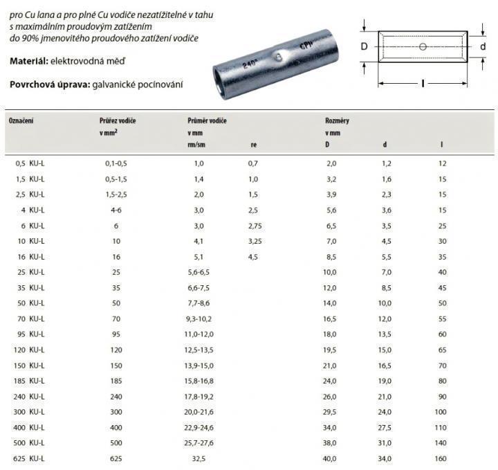 Cu lisovací kabelová spojka lehčená pro Cu lana a pro plné Cu vodiče nezatížitelné v tahu s maximálním proudovým zatížením do 90% jmenovitého proudového zatížení vodiče.