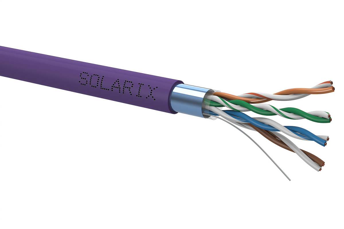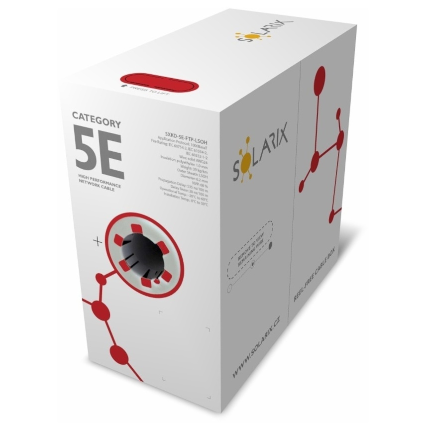 Instalační kabel Solarix s označením SXKD-5E-FTP-LSOH je spolehlivý stíněný kabel kategorie 5E, který je určený pro provoz ethernetových protokolů, včetně 2.5GBASE-T a 5GBASE-T*. Konstrukce kabelu je F/UTP, typ pláště LSOH s třídou reakce na oheň Dca-s1,d2,a1. Vodiče kabelu jsou vyrobeny z kvalitního měděného drátu s čistotou mědi 99,97%. Kabel bez problémů splňuje požadavky z mezinárodních standardů ISO/IEC 11801, EN 50173 a ANSI/TIA 568.2-D. V případě CPR (nařízení EU č. 305/2011) je kabel testován u nezávislé laboratoře FORCE TECHNOLOGY v systému posuzování vlastností AVCP 3. Stejně jako ostatní kabely Solarix, je i kabel SXKD-5E-FTP-LSOH značen metráží po 1 m v rozsahu od 0 do 305 m. Kabel je dodáván ve vysoce odolném třívrstvém leštěném kartónovém boxu (vždy barevně odlišeném podle typu kabelu), na kterém jsou uvedeny všechny nezbytné produktové informace, včetně čárových kódů, výrobní šarže, popisu a nejdůležitějších technických parametrů.