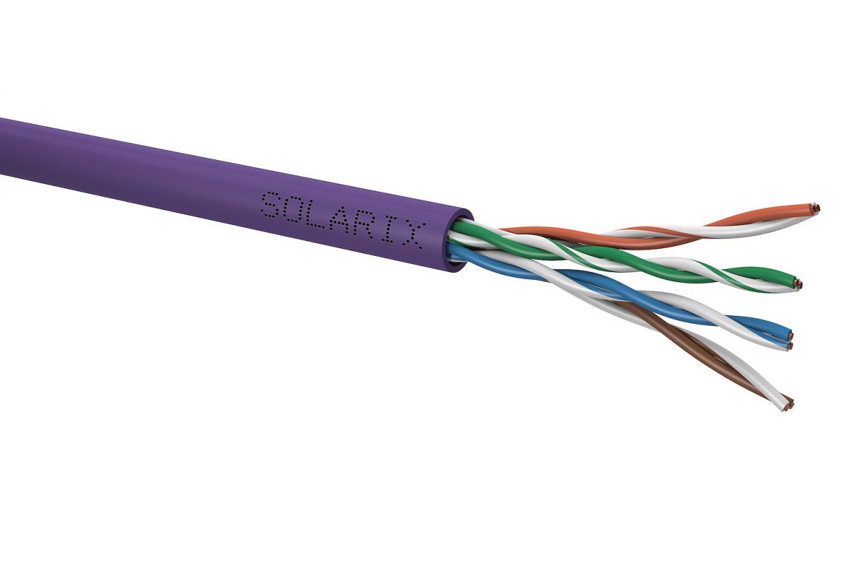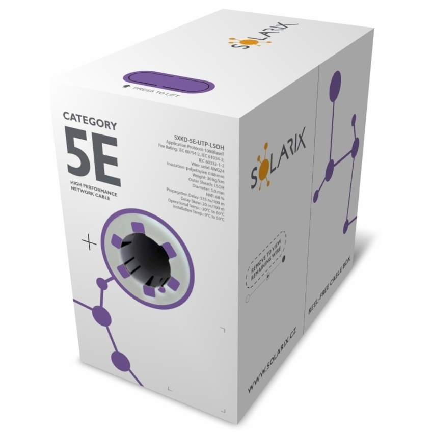 Instalační kabel Solarix s označením SXKD-5E-UTP-LSOH je spolehlivý nestíněný kabel kategorie 5E, který je určený pro provoz ethernetových protokolů, včetně 2.5GBASE-T a 5GBASE-T*. Konstrukce kabelu je U/UTP, typ pláště LSOH s třídou reakce na oheň Dca-s1,d2,a1. Vodiče kabelu jsou vyrobeny z kvalitního měděného drátu s čistotou mědi 99,97%. Kabel bez problémů splňuje požadavky z mezinárodních standardů ISO/IEC 11801, EN 50173 a ANSI/TIA 568.2-D. V případě CPR (nařízení EU č. 305/2011) je kabel testován u nezávislé laboratoře FORCE TECHNOLOGY v systému posuzování vlastností AVCP 3. Stejně jako ostatní kabely Solarix, je i kabel SXKD-5E-UTP-LSOH značen metráží po 1 m v rozsahu od 0 do 305 m. Kabel je dodáván ve vysoce odolném třívrstvém leštěném kartónovém boxu (vždy barevně odlišeném podle typu kabelu), na kterém jsou uvedeny všechny nezbytné produktové informace, včetně čárových kódů, výrobní šarže, popisu a nejdůležitějších technických parametrů.