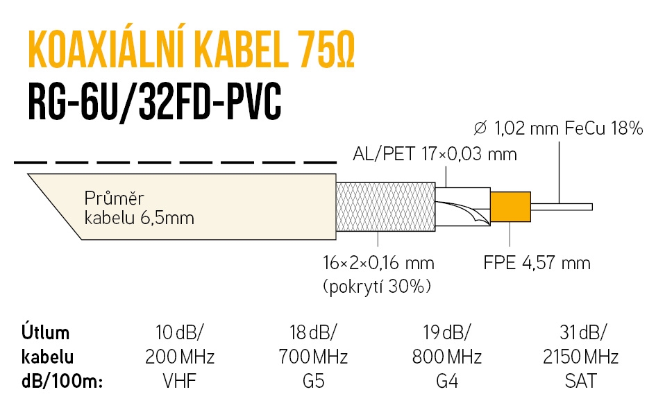 KABEL KOAXIÁLNÍ RG-6U/32FD-PVC BÍLÁ 6,5MM FOLIE 10m KK13D
