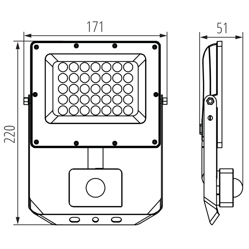 Kanlux ACETE 30W CCT SE GR je výkonný LED reflektor se zabudovaným PIR čidlem a přepínáním teploty chromatičnosti na 3000 K, 4000 K nebo 6500 K. Široký vyzařovací úhel 90° zajišťuje rovnoměrné nasvícení ploch u vstupů, na fasádách i v okolí domů. Tělo z litého hliníku a odolný PC difuzor spolu s krytím IP44 garantují spolehlivý provoz ve venkovním prostředí verze se senzorem. Montáž usnadňuje úhlově nastavitelný držák a přívodní kabel délky 20 cm; PIR čidlo umožňuje nastavit čas sepnutí, prah okolního osvětlení (LUX) i oblast detekce.