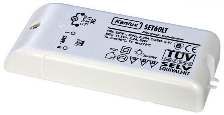 Elektronický transformátor. Vstupní napětí 220-240V~50Hz, 0,26A. výstupní napětí 11,5V~, 4,9A, 60VA
