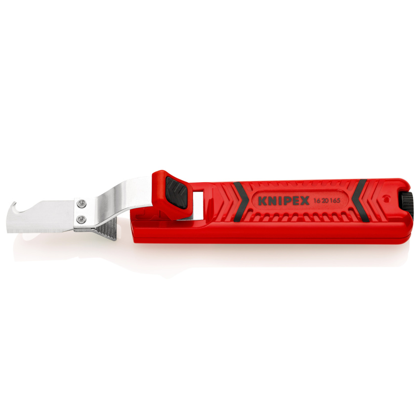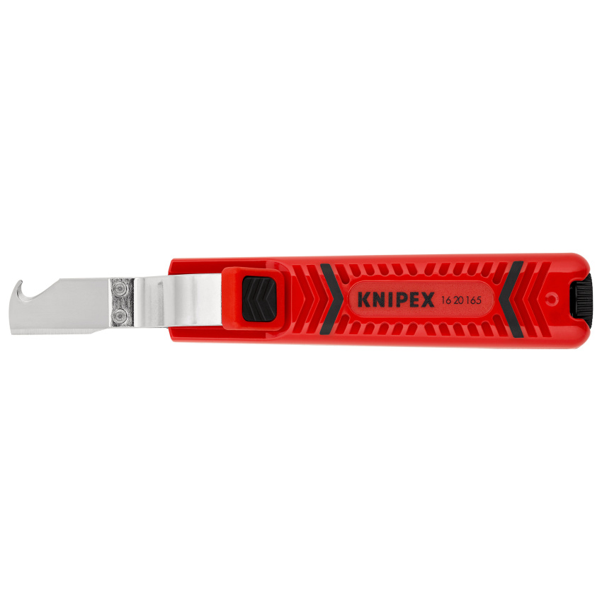 Kabelový nůž s hákovou částí, k odstraňování plášťů všech běžných kabelů kruhového průřezu, s nastavením hloubky řezu pomocí nastavovacího šroubu