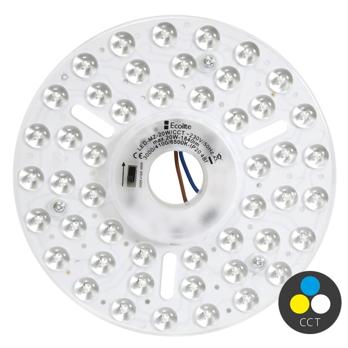LED modul ECOPLANET LED-MZ-20W/CCT s výkonem 20 W, průměrem 17 cm a světelným tokem 1840 lm nabízí nastavitelnou barevnou teplotu a efektivní řešení vnitřního osvětlení s nízkou spotřebou energie.