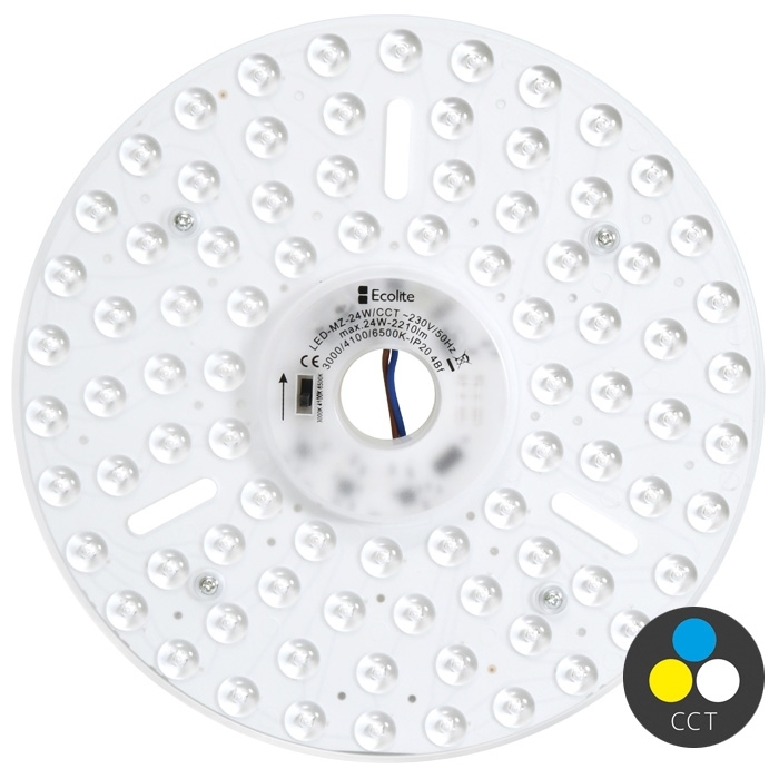 Výkonný LED modul ECOPLANET LED-MZ-24W/CCT o průměru 23 cm a výkonu 24 W s nastavitelnou barevnou teplotou (CCT) a světelným tokem 2210 lm, ideální pro moderní vnitřní osvětlení.