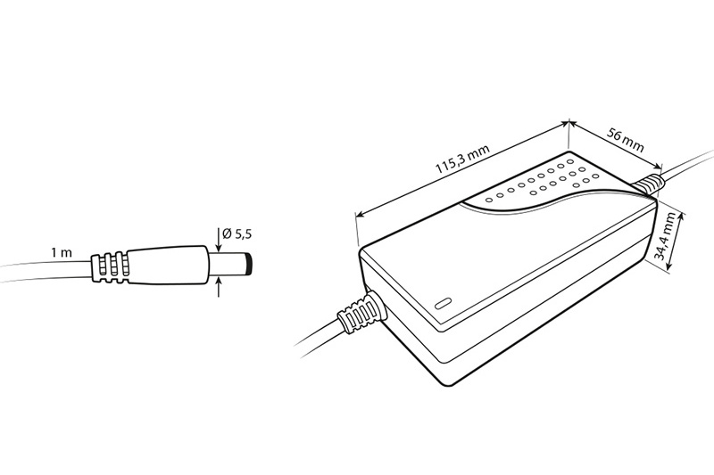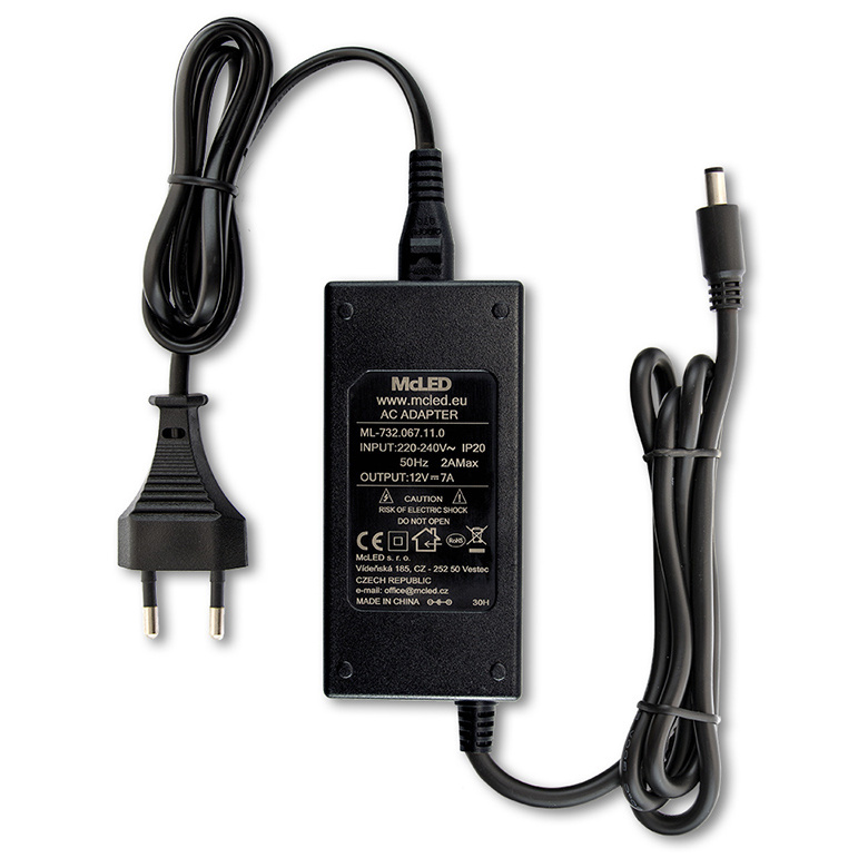 LED napěťový zdroj pro LED pásky 84W, výstup DC 12V/7A. IP20. Pro připojení do zásuvky. Vstupní napětí 220 - 240 V AC, materiál krytu: plast, barva: černá. Rozměry 115,3x56x34,4 mm, hmotnost 0,38 kg. Zdroj SELV, certifikáty: CE, RoHS. Při výběru zdroje počítejte s výkonovou rezervou min. 20%.