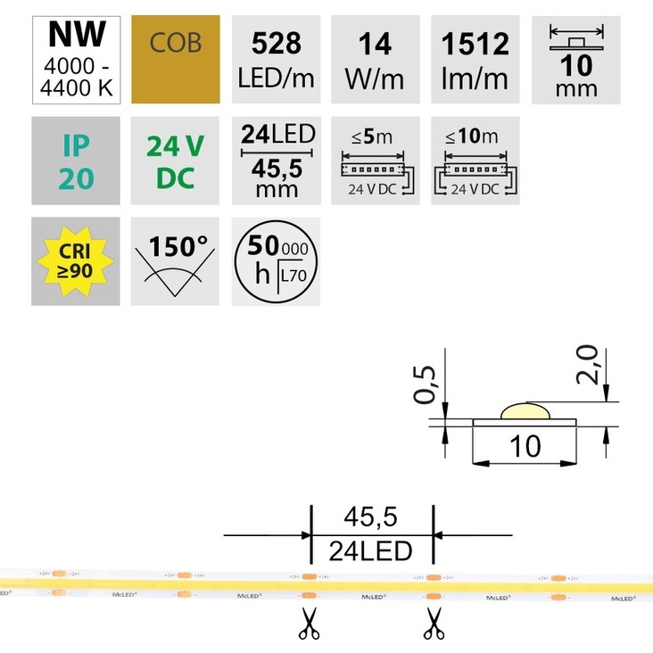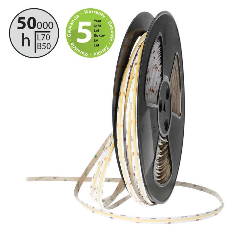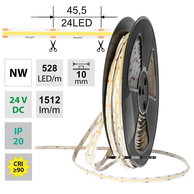 Stmívatelný LED pásek COB, neutrální bílá (4200K), 14W, 528LED, 1512lm/m, CRI>90, segment 45,5mm, 24LED/segment, IP20, DC 24V, životnost 50000h, šíře 10mm, bílý PCB pásek, max. délka pásku při jednostranném zapojení: 5m, opatřen samolepící páskou 3M, UV stabilní. Balení 50m