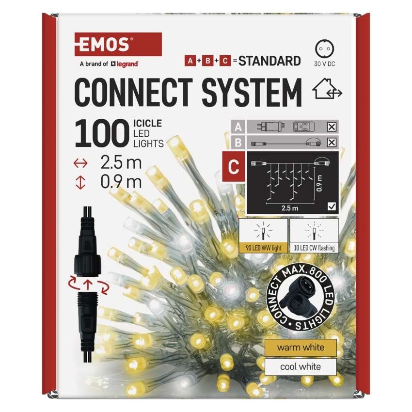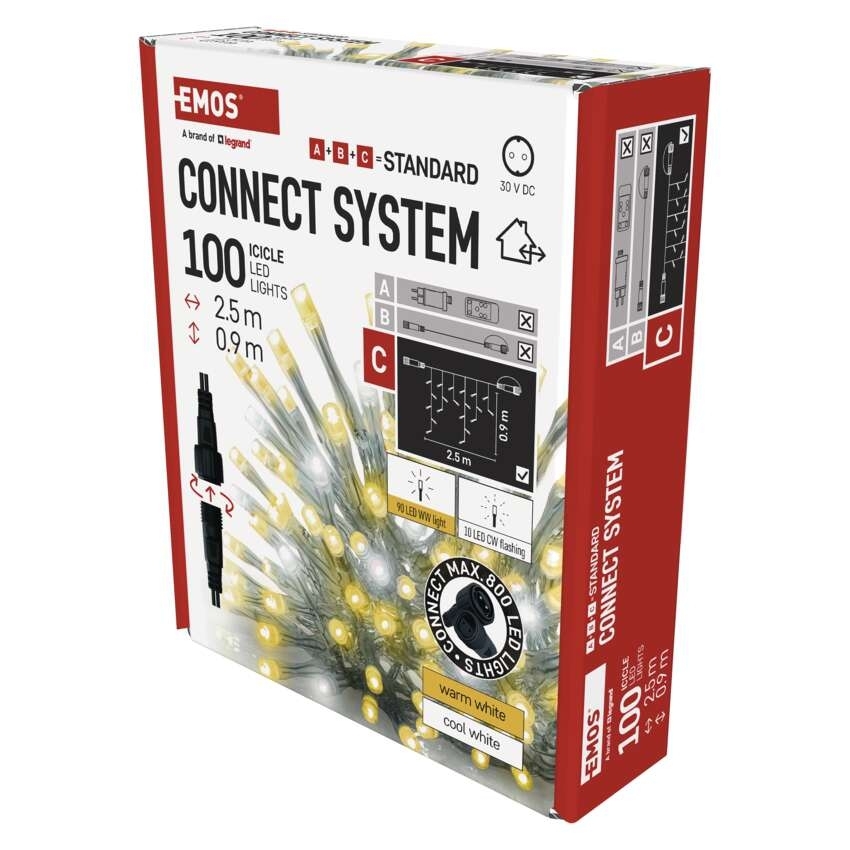 - Propojovací systém CONNECT SYSTEM STANDARD je díky stupni krytí IP44 vhodný k vnitřnímu i venkovnímu použití, avšak pouze v sezónu, nikoliv po celý rok. Výhodou tohoto spojovacího systému je široká nabídka LED světelných prvků (C) v několika různých barvách. Ačkoliv je nejpopulárnějším vánočním osvětlením řetěz, ve spojovacím systému můžete vybírat podle vlastních designových preferencí z krápníků, záclon, sítí nebo hvězd na špičku vánočního stromu. Z jediného napájecího zdroje (A) připojeného k prodlužovacím kabelům, rozbočovačům (B) a světelným LED prvkům (C) je možné napájet až 800 LED světýlek.