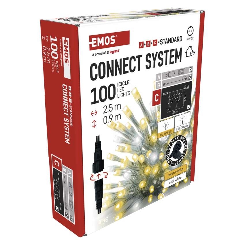 LED propojovací vánoční řetěz EMOS Connecting D1CN01 100LED krápníky studená/teplá blikající bez zdroje