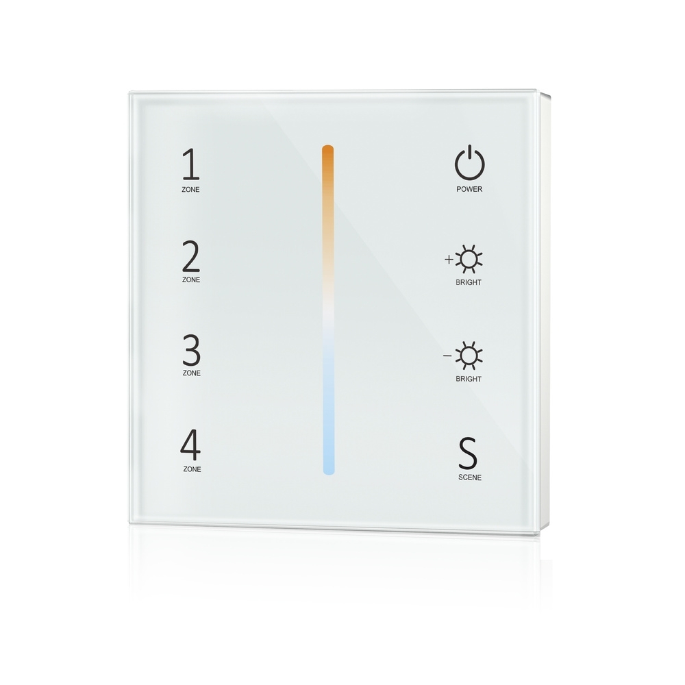 Ovladač s vysokofrekvenční technologií. Vlastnosti výrobku: Nástěnný dotykový panel k rádiovému ovládání modulů Tunable White LED. Výstupní signál: 2,4 GHz. Vstupní napětí: 100…240 V. Výhody výrobku: Velmi citlivý dotykový panel z vysoce pevného skla s podsvícením a s dotykovým posuvným ovladačem teploty chromatičnosti uprostřed. Ovládání až 4 zón. Stmívání nastavených barev světla. Snadná výměna za standardní vypínač světla. Oblasti použití: Všeobecné osvětlení. Architektonické osvětlení. Dynamické světlo jako architektonický prvek ve veřejných prostorách. Nepřímé osvětlení. Hotely. Kanceláře. Obytné interiéry.