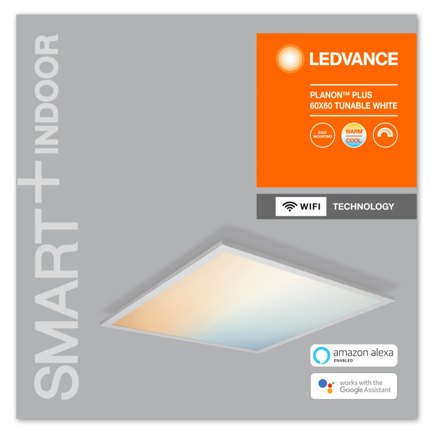 Panelová svítidla s technologií WiFi. Vlastnosti produktu: Ovládatelné pomocí LEDVANCE SMART+ WiFi aplikace (s minimem Android 4.4 nebo iOS 9.0). Možnost hlasového ovládání: Google Assistant nebo Amazon Alexa. Stmívatelné. Nastavitelná teplota chromatičnosti pomocí laditelné bílé: 3 000…6 500 K. Síťový protokol: WiFi. Výhody produktu: Snadná a rychlá instalace. Druh použití: Použití uvnitř. Kuchyně, obývací pokoje, dětské pokoje nebo domácí pracovny. Výbava / příslušenství: Včetně upevňovacích držáků. Včetně montážních šroubů a spojovacích kolíků. Pro ovládání pomocí aplikace nebo pro hlasové ovládání je zapotřebí kompatibilní systém Smart Home.. Pro ovládání pomocí aplikace LEDVANCE SMART + WiFi je zapotřebí chytrý telefon nebo tablet.